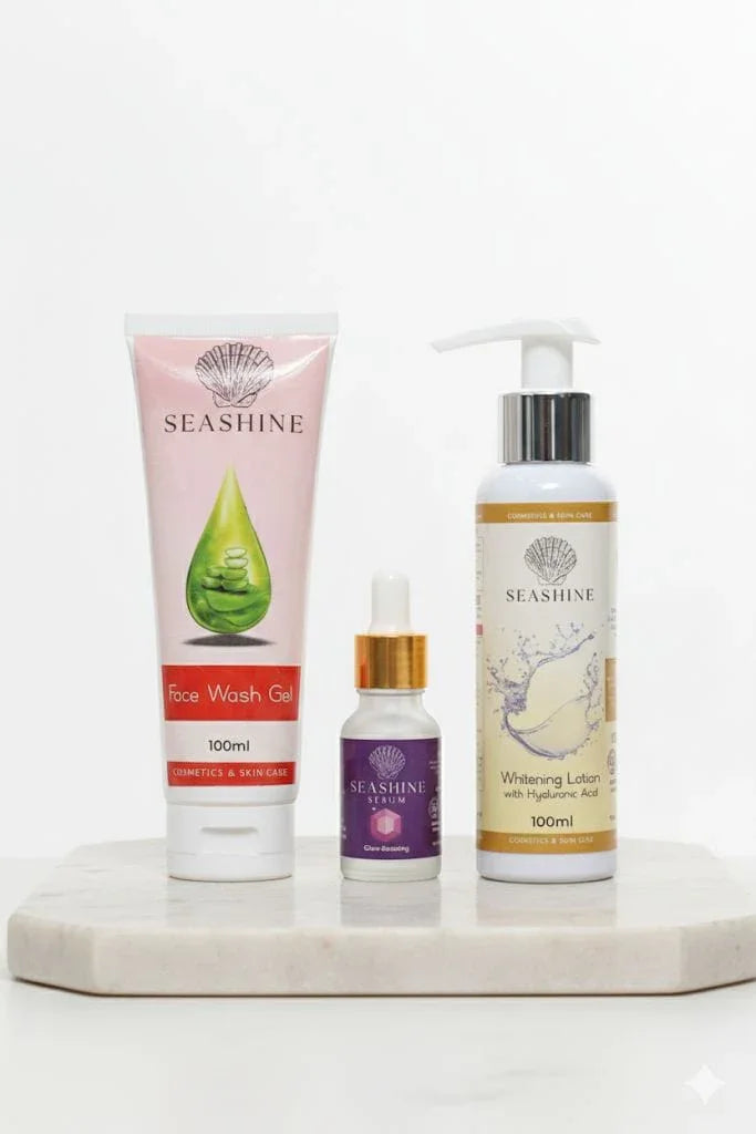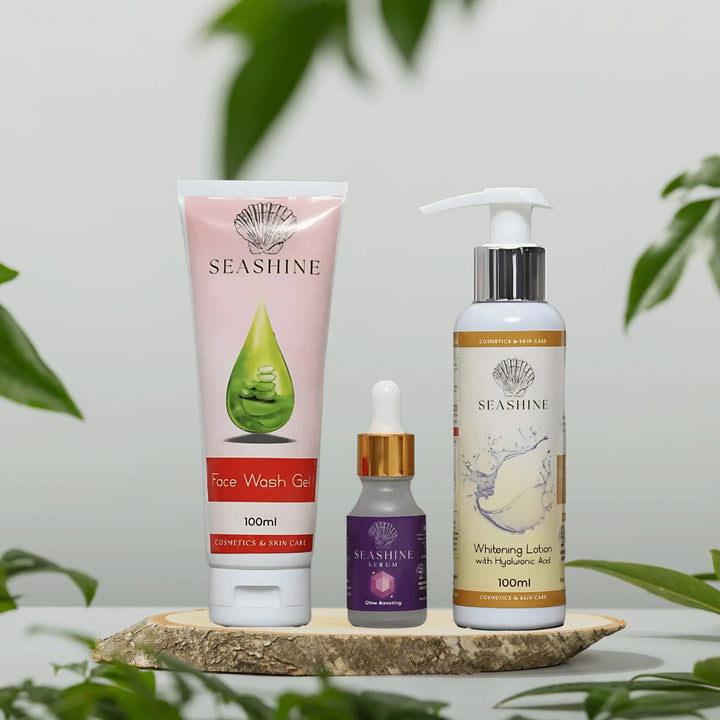 Transform your skincare routine with this exclusive Sea Shine deal! The Sea Shine Gel Face Wash deeply cleanses and refreshes, the Glow Boosting Serum enhances your natural radiance for a luminous finish, and the Moisturizer Lotion locks in hydration to keep your skin nourished and silky smooth. Achieve healthy, glowing skin effortlessly with this perfect trio!